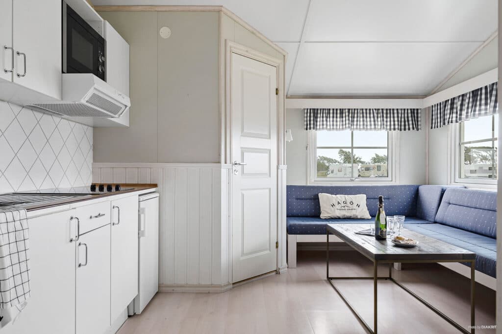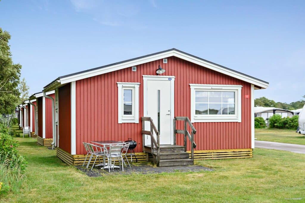 Kitchen with stovetop with 4 hubs, fridge, microwave oven, dishwasher, coffee percolator (1×4 filters), electric kettle and a basic set-up for what 4 persons might need for self catering in a summer kitchen. There’s 1 bedroom with a twinbed, 1 bedroom with a bunk-bed. All beds with comfort mattresses, toilet and shower, flat screen-TV (32”) with free channels. The adjoining patio in the south has a table and 4 chairs. Please note that pets are NOT allowed in these cabins.