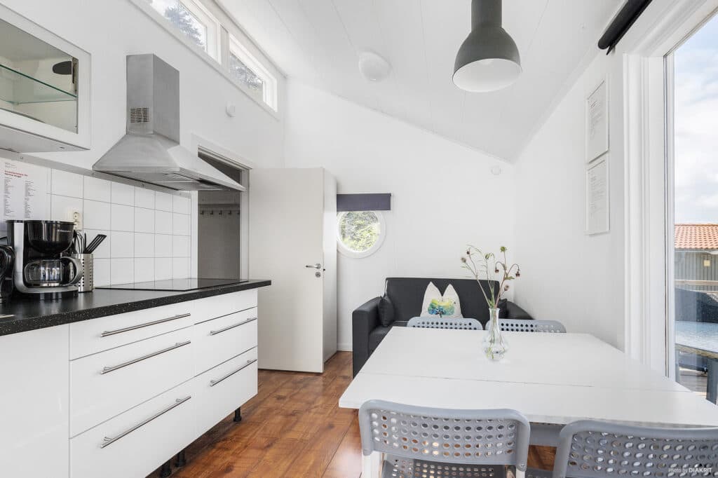 Nice and bright cabin of 25 sqm, with a total of four beds. The beds are distributed with two beds in one bedroom and a sofa bed in the living room with space for two people. In the cabin, you can easily prepare your own dinner in the kitchen, which is equipped with a stove, microwave, refrigerator and coffee maker. Enjoy your meals at the kitchen table or on the cabin’s terrace with a lovely view. The cabin also has a bathroom with shower and toilet. When you live in a Skagerack cabin, you are also close to a playground. Perfect for families with children who want proximity to mischief and play.