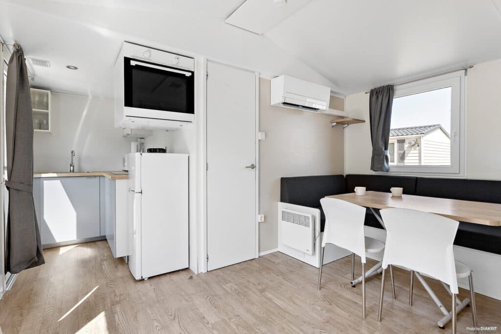 In this mobile home, you’ll stay in 32 spacious sqm with space for 4 beds, divided into two rooms. One room has a double bed and the other has two single beds. A perfect option for families or groups of friends who need a bit more space. The mobile home also has a shower and toilet for extra convenience. You can also prepare your own meals here as there is a kitchen/kitchenette, microwave, fridge, freezer, coffee maker, and dining area. Yes, everything for a complete holiday. In the living room, there is also a TV. Outside the door, you’ll find a lovely terrace where you can enjoy the beautiful surroundings of the site.