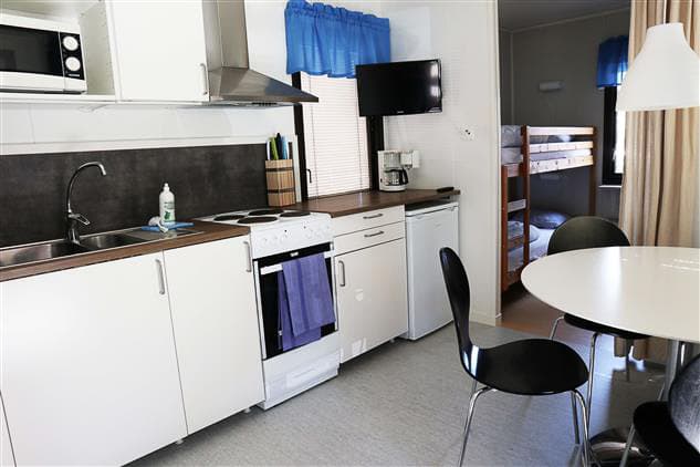 Västbjörkastuga is 18 sqm in size and sleeps a total of four people. Each cabin has two bunk beds, with duvets and pillows for all beds. The kitchen is equipped with a stove, an oven, a fridge, a microwave, a coffee maker and utensils. The TV in the living room. The bathroom has a shower and a toilet.