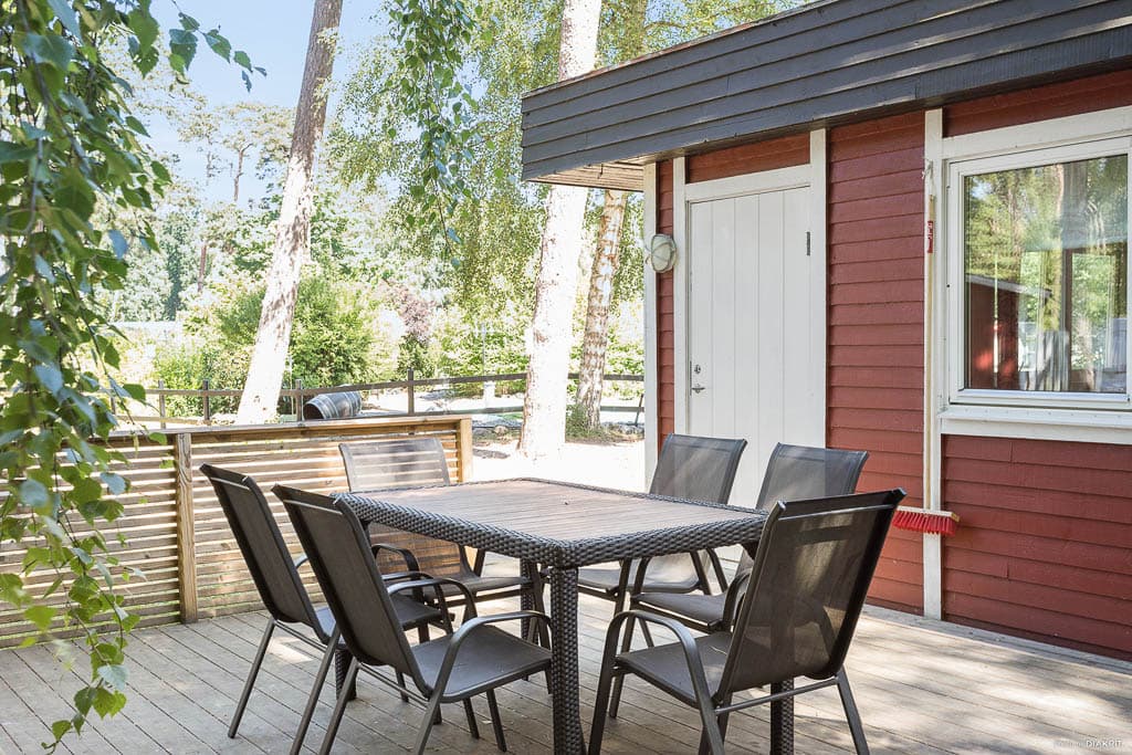 Ängalagslängan is the campsite’s most spacious cabin at a full 65 sqm, accommodating up to 6 people. The cabin has one bedroom with two single beds (which can easily be made into a double), one bedroom with a bunk bed, and a sofa bed in the living room. Duvets and pillows are provided for all beds in the cabin. The kitchen is fully equipped with a stove, oven, fridge, freezer, microwave, and dishwasher for maximum convenience. The cabin also features a large and fresh bathroom with a shower, toilet, and washing machine. In the living room, there is a cozy sofa corner with a TV and access to a large, lovely furnished patio.