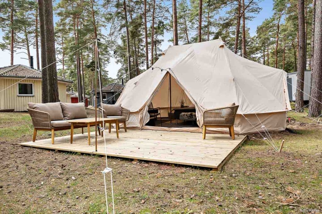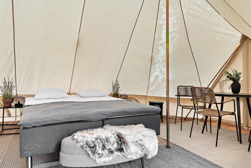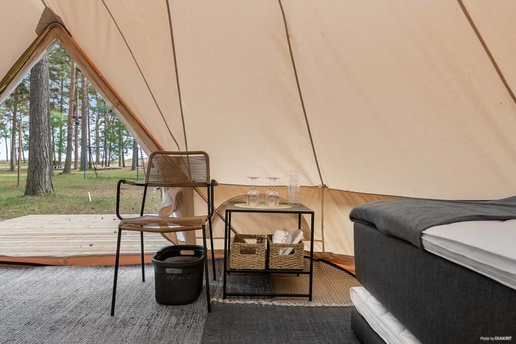 Welcome to Glamping Tent Yngsjö! Here, you stay in a cozy 20-square-meter space and can enjoy a truly unique accommodation experience. The tent accommodates up to four people with a double bed and a pull-out single bed. It is also equipped with a refrigerator and a basket with plates and cutlery for four people. Outside the tent, you’ll find a lovely furnished patio. It’s the perfect spot to sit and watch the sunrise in the early morning or enjoy a delicious dinner on a warm summer evening.