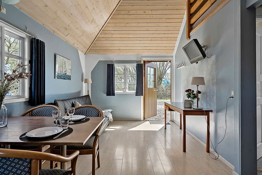 The Storebælts cabin is 30 m2, with 6 beds in 2 bedrooms + 1 loft + 1 sofa bed. There is also a toilet, shower and television with DR channels. They are located on the first row in relation to the reception, water park and playground. In the cabins there is a kitchen section with kitchenware, 2 hotplates, crockery, mini oven, fridge and coffee machine. There are duvets and pillows for the number of people registered on the unit. On the terrace there is a table and chairs.