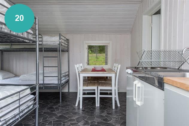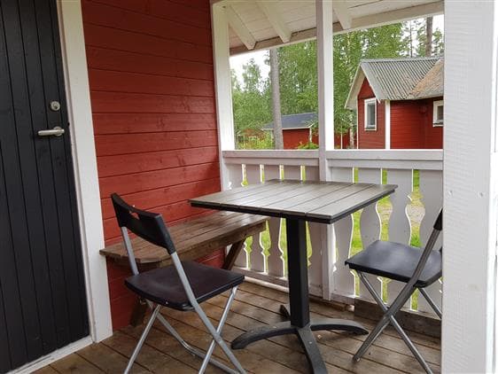 Byälvsstuga Plus is 23 m2 in size and sleeps four people. The cabin has two bunk beds, with duvets and pillows for all beds. The cabin also has a kitchenette with two hobs and refrigerator-freezer and is equipped with a coffee maker and utensils. TV, kitchen table, four closet, shower and toilet. There is a small, roofed terrace. Four picnic tables are available in the common area on the lawn outside the cabin. Cabin 20 has a different floor plan than the others in the same category but has the same number of beds. If you wish to see the floor plans of the cabins, please select a specific cabin when booking.