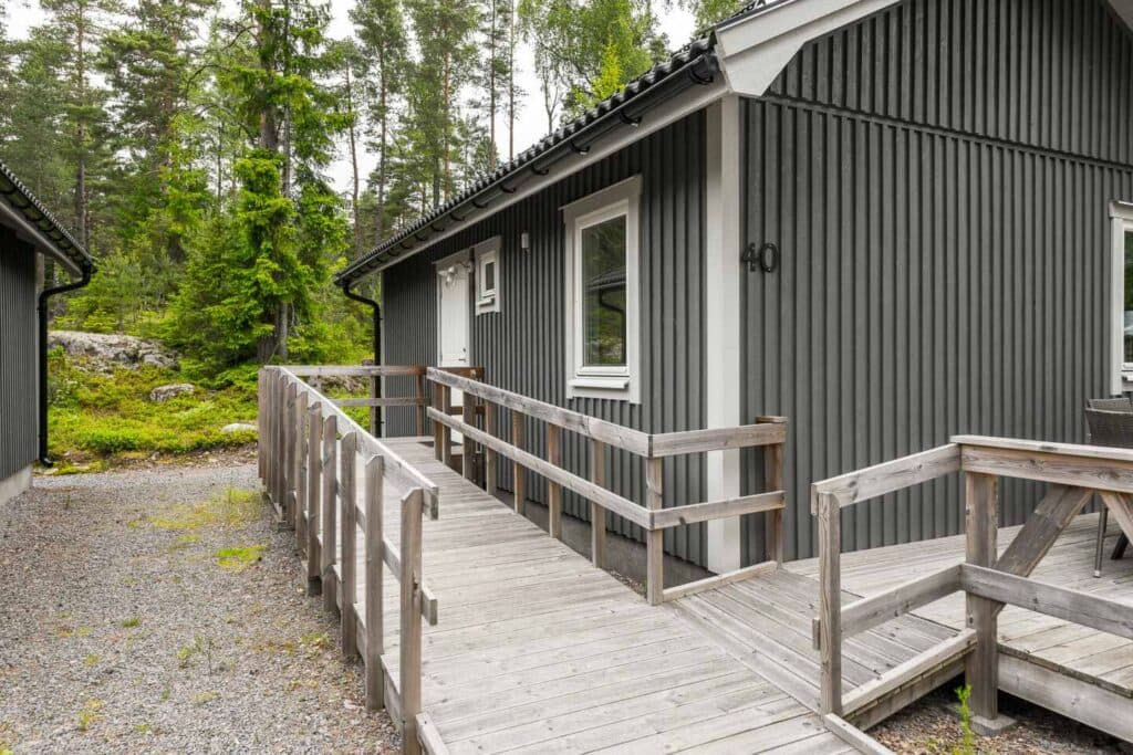 Vänernstuga is 28 m2 in size and has a total of six beds. Cabins 40-43 are painted grey and have two bedrooms. One has a queen-sized bed and the other has two bunk beds. Duvets and pillows are supplied for all beds in the cabin. Kitchen with utensils, stove/oven, microwave and coffee makers. Kitchen table with six chairs, a sofa and TV. Bathroom with shower and toilet. Terrace with table and chairs for six people. Vänernstuga 30 is painted red and has three bedrooms. Two bedrooms have two single beds each and one bedroom has a queen-sized bed. There is also a dishwasher. Cabin 40 has a wheelchair ramp up to the door.