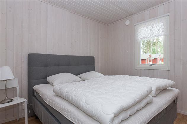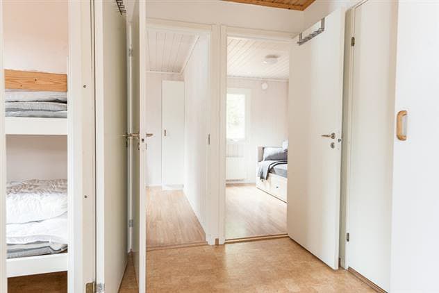 Vänernstuga Plus is 44 m2 in size and sleeps eight people. The cabin has three bedrooms. One has a queen-sized bed, one has two bunk beds and the one has two single beds. Duvets and pillows are supplied for all beds in the cabin. The kitchen is equipped with utensils, stove/oven and coffee maker. There is also a kitchen table, eight chairs, a sofa and TV. Bathroom with shower and toilet. Terrace with table and chairs for eight people. Vänernstuga Plus number 15 has no freezer, but the refrigerator has a smaller freezer compartment.