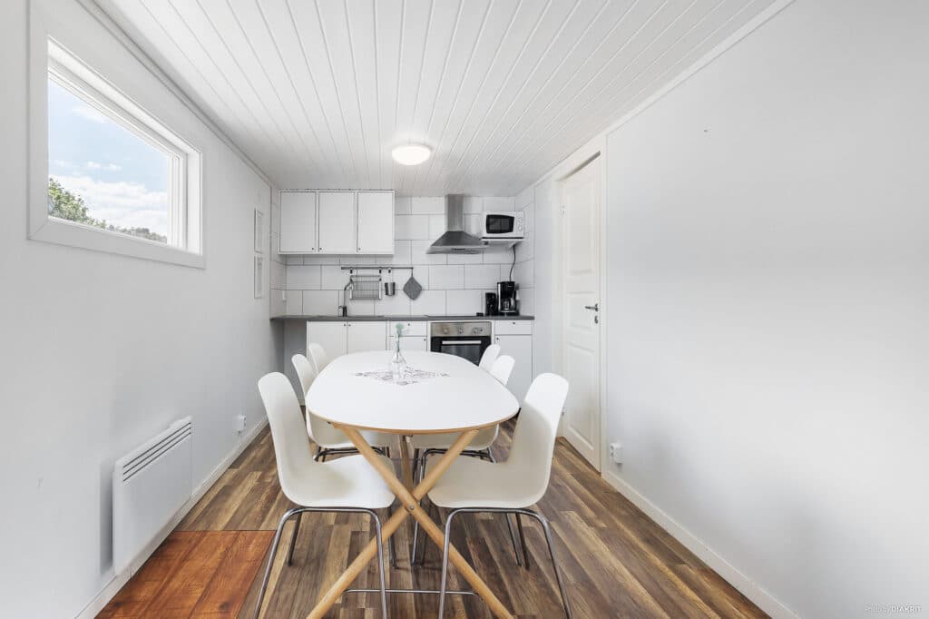 Strandbyn Plus is the perfect option for a large family or those who prefer a bit of extra space. Here you’ll stay in 25 sqm with 6 beds, divided into two separate bedrooms, one with two bunk beds and one with two single beds. The cottage has its own bathroom with a shower and toilet. There is also a kitchenette with a stove and oven, microwave, fridge, and coffee maker. Perfect for those who want to prepare meals with loved ones during their stay. Then enjoy breakfast, lunch, or dinner at the dining table in the cottage.