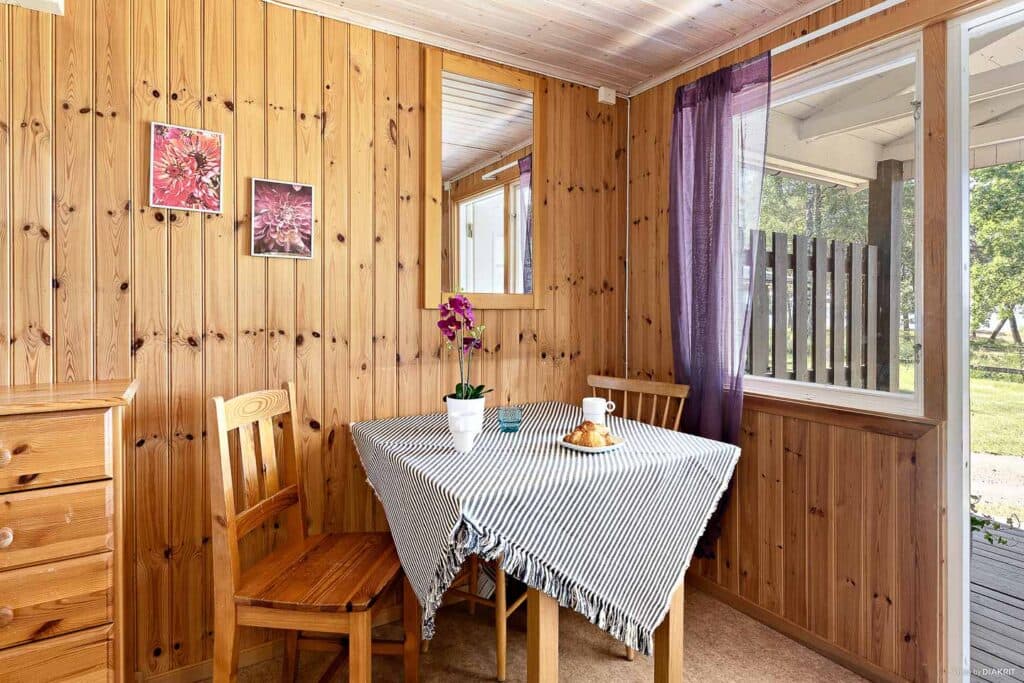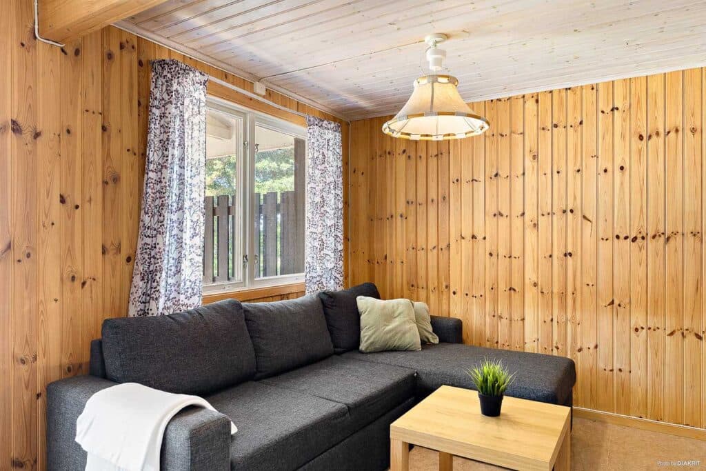 The beds in the living area consist of a bunk bed and a sofa bed for two people. The cabin also includes a kitchen/kitchenette equipped with a hot plate, refrigerator, coffee maker, kettle, microwave, and basic kitchen utensils. Cold running water is available in the cabin. Shower and toilet facilities are located in the service building on the site. You’ll be staying close to both the beach and the service building. Outside the cabin, there’s a pleasant terrace with a bench and table – perfect for enjoying your morning coffee outdoors.