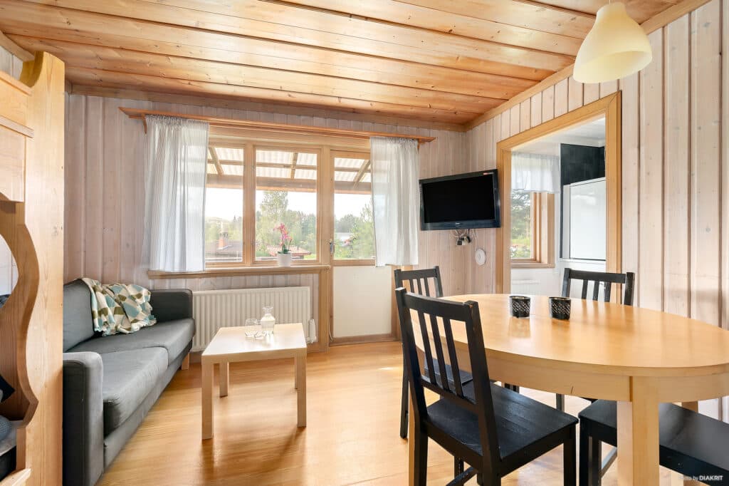 Bornstuga is a cottage with 30 – 35 m2 of space that sleeps a total of six people. All the cottages are unique but feature the same number of beds, and approximately the same floor area. Cottages 49, 50, and 54 feature two bedrooms with a bunk bed in each. Cottage 58 features only one bedroom with two single beds, and features a bunk bed in the common room as well. Duvets and pillows are supplied for all beds in the cabin. Bathroom with shower and toilet. There is a TV and dining area in the common room. The kitchen features basic utensils, as well as a stove, oven, microwave oven, refrigerator, and coffee maker. Cottages 54 and 58 also feature freezers. A closed stove is included in cottage 49, while cottages 50 and 54 feature open fireplaces. Engine heaters are available for the cottage. If you wish to see the floor plans of the cabins, please select a specific cabin when booking.