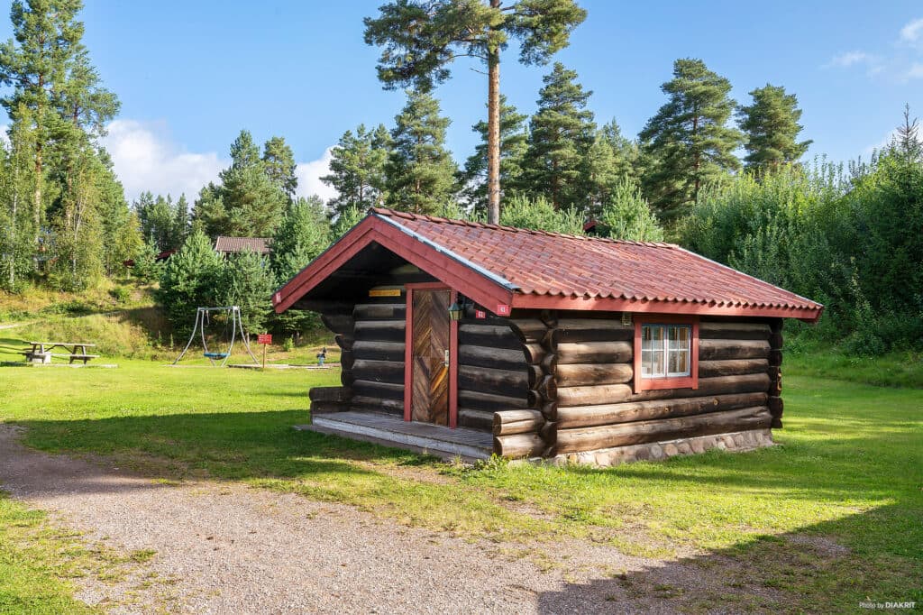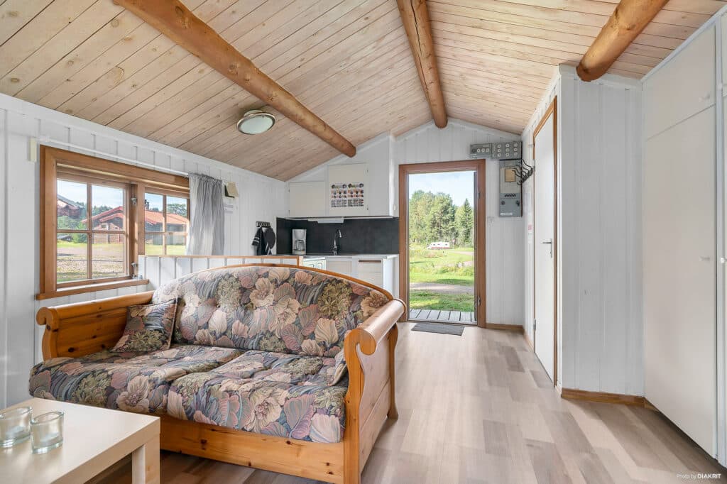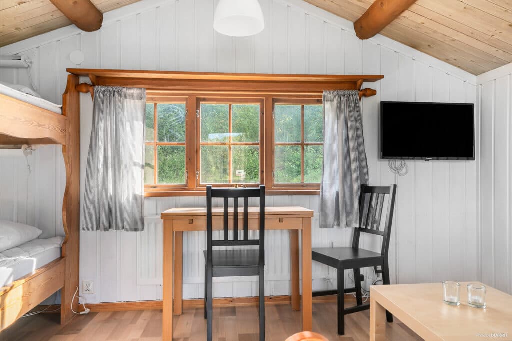 The Orestuga is 18 square meters and can accommodate a total of two people. There is a bunk bed in the cabin, and bedding with pillows are provided for all beds. There is a toilet in the cabin, but no shower. Showers are available in the service building for use. The cabin is equipped with a TV, dining area, and a kitchen with a stove, oven, refrigerator, and coffee maker. The cabin also has a block heater outlet for vehicles.