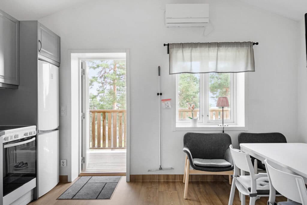 Kuststuga is a cozy cabin with the best views of the coast! Perfect for you who want to wake up to beautiful views and enjoy the wonderful surroundings. The Kuststuga are the largest cottage type at the destination, with 24 sqm. These are cozy cottages with four beds, divided into two bunk beds with 90 cm wide slaves. The cabins have a well-equipped kitchen / living room with stove, fridge and freezer, coffee maker, kettle and TV + two comfortable armchairs. The cottage also has a separate toilet and shower.