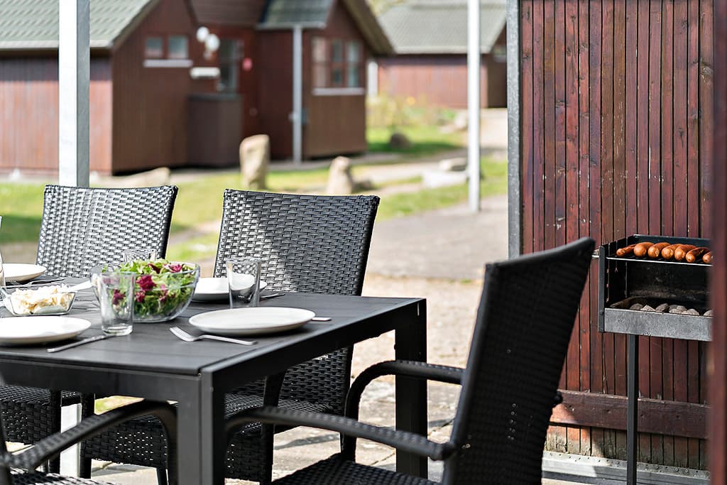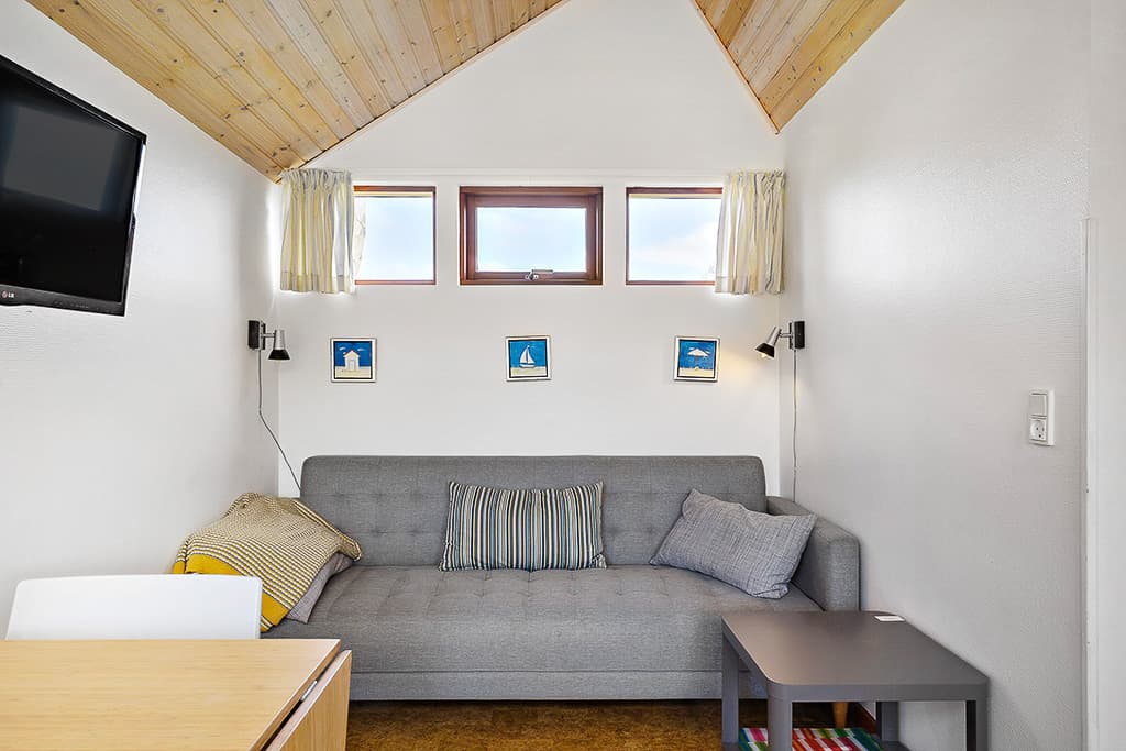 The cabins are designed for 5 people (4 normal beds + 1 extra bed in the living room) and are non-smoking. The cabins are 25 m² with own toilet and bath, separate bedroom and loft with a view to the stars. The cabins have a nice, spacious living room, large kitchen. All crockery, hot and cold water, 4 hotplates, oven, fridge w/freezer, dishwasher, coffee machine and TV. You will find garden furniture and a barbecue on the lovely covered terrace with good sheltered conditions. Light duvets and pillows are available in the cabin. The Kollund cabins have been renovated in 2020 with, among other things, new larger kitchen. Cabin prices are incl. electricity, heat and water. For rent all year round!