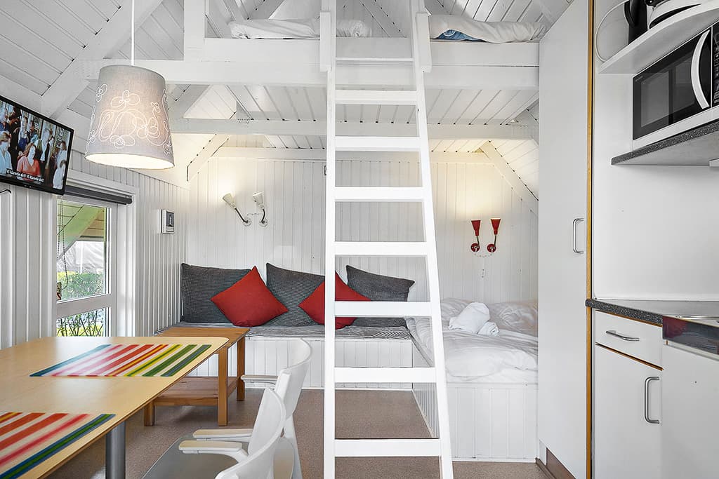 Super cozy cabins with loft, dining area, sofa arrangement which is also sleeping space for 2 people. TV, kitchen niche with 2 hotplates, microwave, fridge w/freezer, coffee machine all in crockery and hot and cold water in the tap. The cabins are non-smoking. You will find garden furniture and a barbecue on the lovely terrace. Light duvets and pillows are available in the cabin. Cabin prices are incl. people, electricity, heat and water.