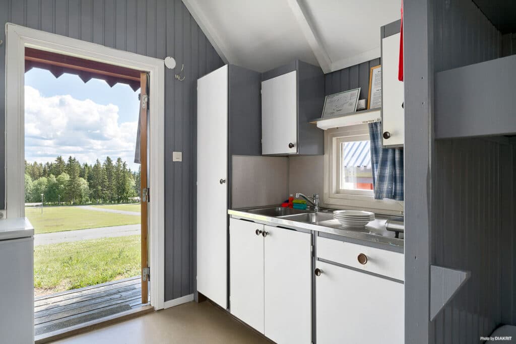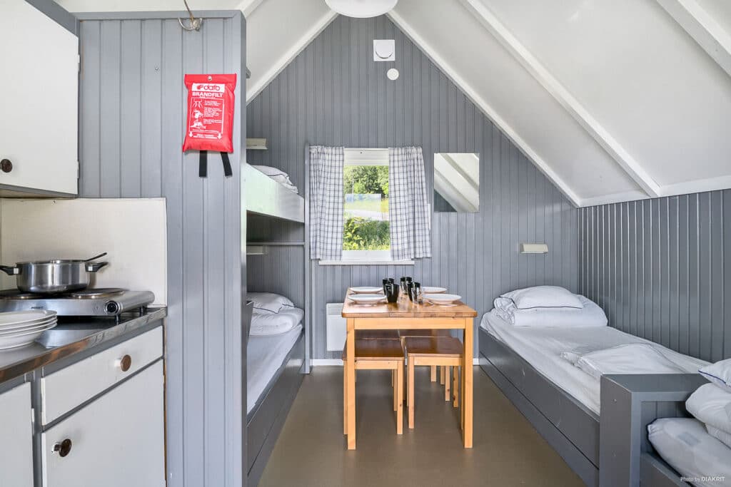 15 m² cabin with 4 beds and hot and cold mainswater. Lovely open views over the lake and parts of Östersund. A bunk bed and two single beds and a dining area for 4 persons. Hotplate, sink, small fridge and basic kitchen equipment for 4 people. Small porch with 2 fixed benches each side. Access to showers, lavatories and kitchen is provided in the service house. Open only during the summer.
