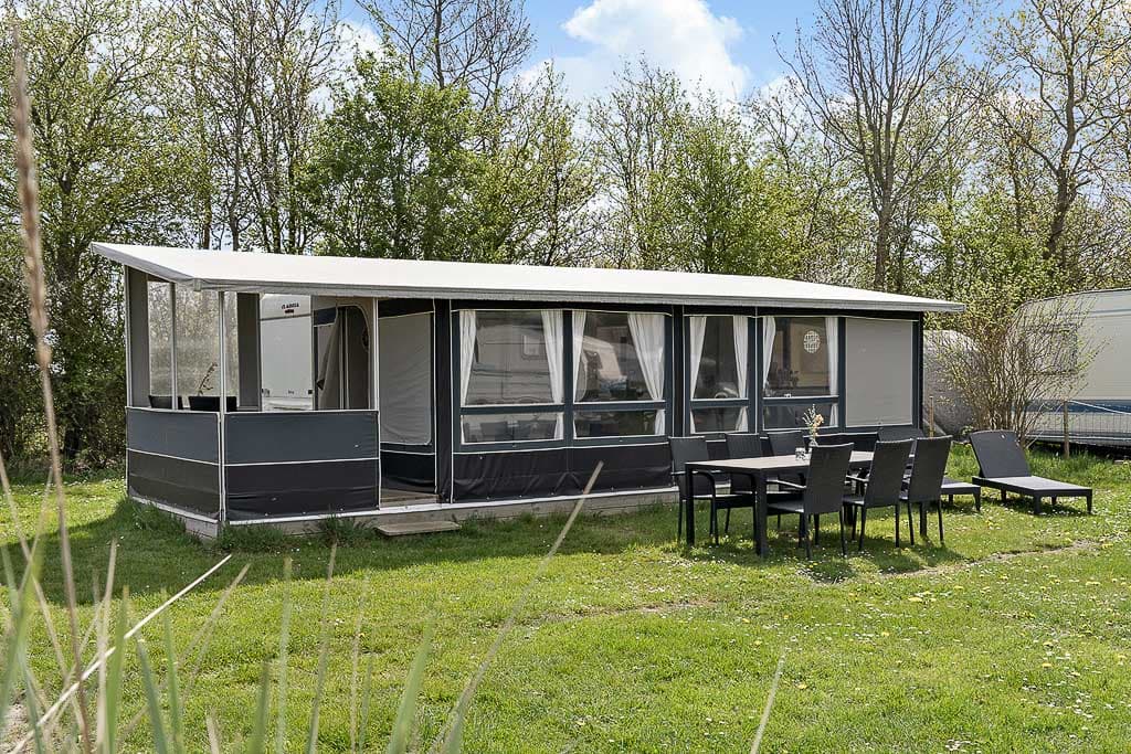 The caravan accommodates up to 7 people, with one small bed, three bunk beds, and a sofa bed. It also includes a kitchen with a fridge and small freezer, a bathroom with toilet, a spacious awning with a dining area, and a small veranda overlooking the football field. Duvets and pillows are provided. Please bring your own bed linen, or order a linen package from us in the final step of the booking process.