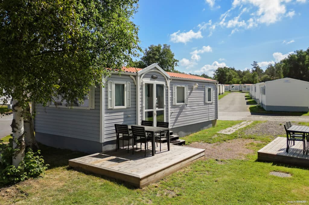 Spacious, comfortable living, perfect for a couple on holiday or for people looking to enjoy extra comfort on business trips. The cabin has a kitchen with spacious cupboards, a hob, oven, fridge and also a freezer. Large, stylish living room with a comfortable sofa, coffee table, spacious cupboards and a TV. Open plan living with dining area and dining table for four people. Bedroom with double bed and a spacious wardrobe, plus a smaller bedroom with two single beds. The bathroom is equipped with a shower, washbasin and a separate toilet. There is also electric heating.