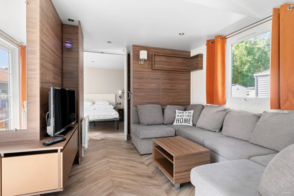 Our most elegant cabin with a modern kitchen equipped with spacious cupboards, a hob, oven, fridge and freezer. Spacious living room with a comfortable sofa, coffee table, TV, dining table and four chairs. Bedroom with a double bed, very spacious wardrobe, dressing table and French window. Two small bedrooms with single beds and wardrobes. Also, the cabins each have a bathroom with a shower, washbasin and a separate toilet. There is also electric heating.
