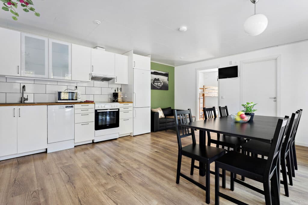 Newly built and modern cabin divided into three separate bedrooms, one bedroom with two single beds and two bedrooms with a bunk bed each. Pillows and blankets are provided in the cabin. Fully equipped kitchen, featuring a dishwasher, fridge and freezer, stove with oven, microwave and coffee maker. Fully tiled bathroom with toilet, shower, washing machine and dryer. The cabin also features a beautiful 25-sqm porch with outdoor furniture for beautiful evenings!