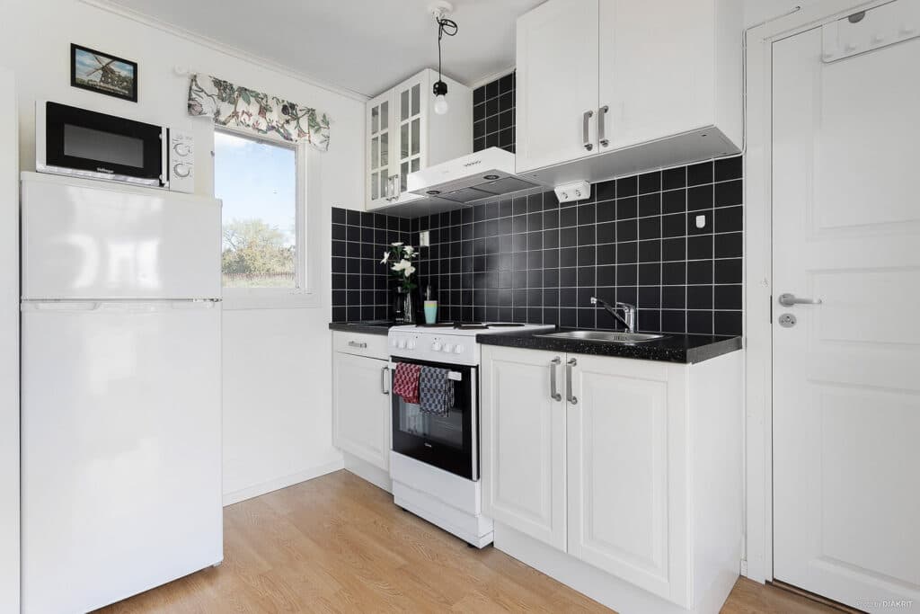 Small and cosy 4-bed cottage with all the important details. The cottage is available in two designs. Cottages 3, 10, 13, 15, 21, 24, 25 and 26 are equipped with a bunk bed and a sofa bed. The remaining cottages have two bunk beds. Pillows and blankets are provided in the cottage. Fully equipped kitchen with fridge and freezer, microwave, stove with oven and coffee maker. Bathroom with shower and WC. Covered porch with simple outdoor furniture for beautiful summer evenings.