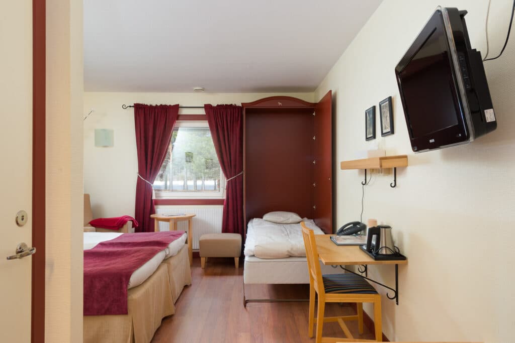 3-bed room with two single beds that stand together as a double bed, and one fold-down single bed. Bathroom with shower, toilet, and hair dryer. TV channels: SVT1, SVT2, TV3, TV 4, Kanal5, TV6, Viasat Sport, and Barnkanalen (Kids’ Channel). Breakfast, bed linen, and cleaning included.