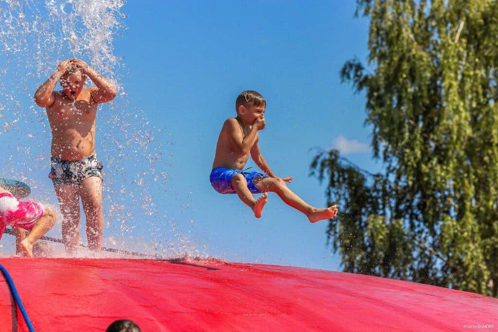 An inflatable obstacle course with tricky passages and high obstacles floating out in Fryken. Wipe-Out is a demanding obstacle course where a small misstep will land you in the water.