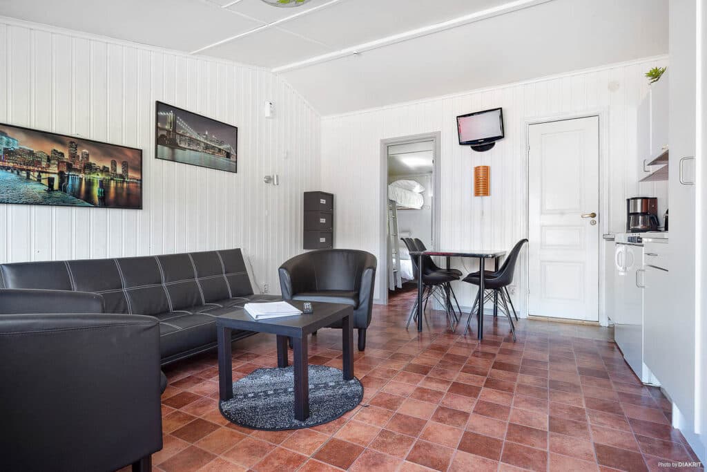 Nice cabin spread over 26 beautiful square meters. In the cabin there is a sleeping cabin with two bunk beds and a sofa bed for an adult in the living room. In the cabins kitchenette you will find means for easier cooking in the form of stove, fridge, freezer, microwave and coffee maker. Then enjoy your meals around the dining table, which is equipped with four chairs. TV is available to snuggle in front of the living room for those who want. The cabin also has a private bathroom with shower and toilet. The cabins furnished porch is perfect for long breakfasts or a nice evening coffee with your loved ones.
