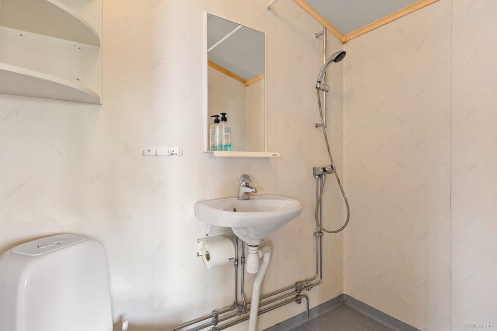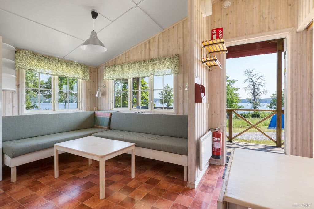 Here is one of our larger cabins at the destination. Norastuga Extra has an area of 26 sqm and can accommodate up to 6 people. The beds are divided into two separate bedrooms where bunk beds can accommodate up to four people. The living room also has a sofa bed where two more people can be accommodated for the night. Norastuga Extra is equipped with kitchenette, fridge, freezer, microwave and coffee maker. Enjoy your meals around the dining table or on the pleasant terrace outside the door. If you want to relax and take it easy in the evenings, there is a TV in the living room. The cabin is also equipped with toilet and shower. Cabin 17 has a wheelchair ramp.
