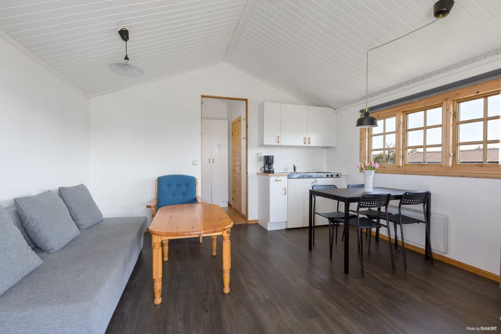 Here is one of our larger cabins at the destination. Norastuga Plus is a cozy cabin that with its 26 square meters can accommodate four beds in two rooms. The beds are divided into a bunk bed and a sofa bed that can accommodate two people. Norastuga Plus is equipped with a private bathroom with shower and toilet. There is also a kitchen with a stove, fridge and freezer and a coffee maker. Outside the door there is a nice terrace where you can enjoy your morning coffee or good meals with loved ones. Enjoy good accommodation close to lovely and soothing surroundings.