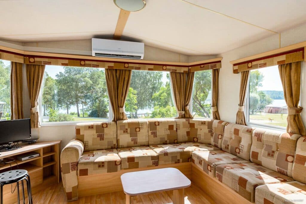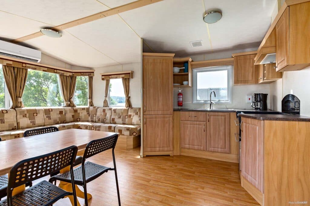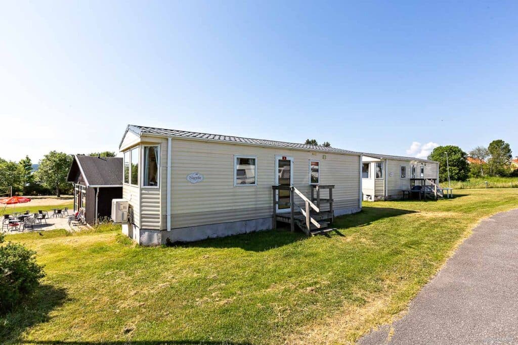 A cozy mobile home that accommodates the whole family with six beds. The sleeping areas are divided into two separate bedrooms – one with a double bed and one with two single beds. There is also a sofa bed in the living room with space for two people. The charming kitchen is equipped with a fridge, freezer, stove, and coffee maker – perfect for preparing dinner. There is also a TV and a pleasant social area where the whole family can relax. The mobile home also has a private bathroom with a shower and toilet for a comfortable stay.