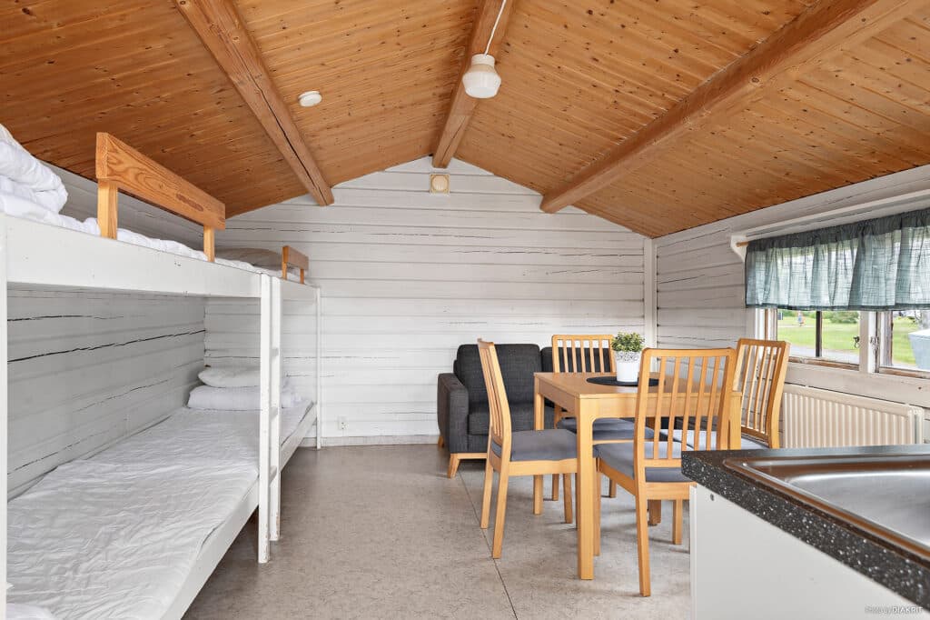 Hjortronhytt is a cabin of 16 square meters that can accommodate up to four people. Here you can enjoy the holiday tranquility in all its simplicity. The cottages contain two bunk beds, a sofa, a dining area for four people and a kitchenette with a fridge and hotplates. Blankets and pillows are available for all beds in the cottage. Both electricity and water are included here. Toilet, shower and kitchen can be found in the campsite’s service building. Parking is available next to the cottage.