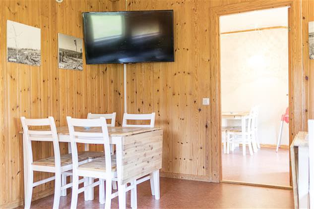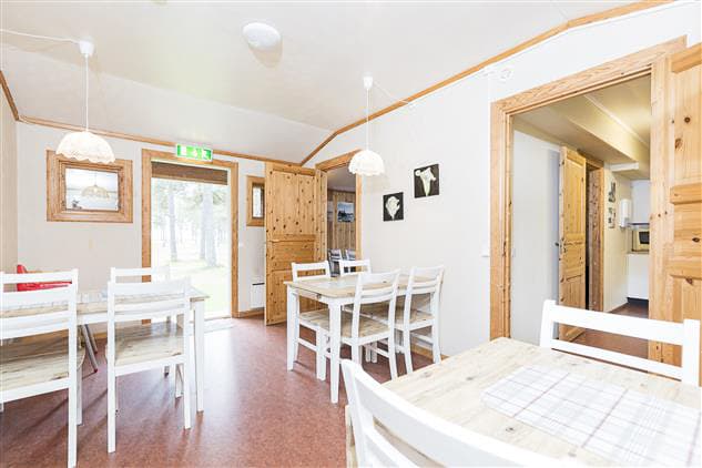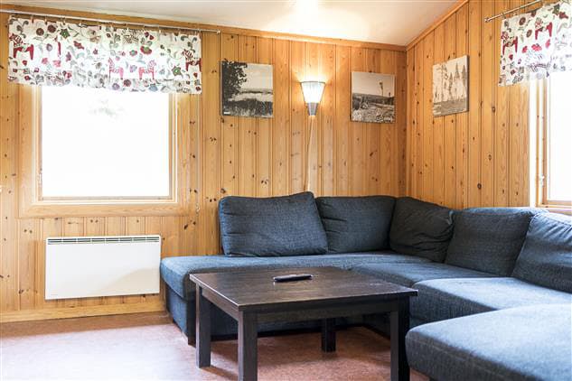The Dalastuga Cabin is a large cabin that sleeps 20 people. Five 9-sqm rooms that each sleeps 4. Two bunk beds in each room, and duvets and pillows for all beds. The cabin has a living room with sofa and TV. Dining room and kitchen equipped with stove, refrigerator, freezer, microwave, and percolator. The cabin has two bathrooms with shower and toilet.