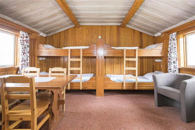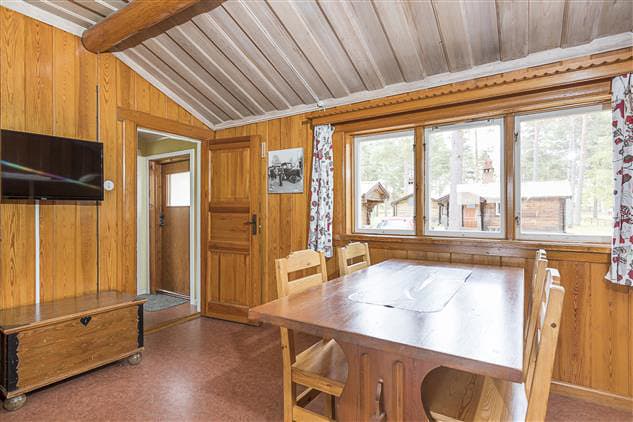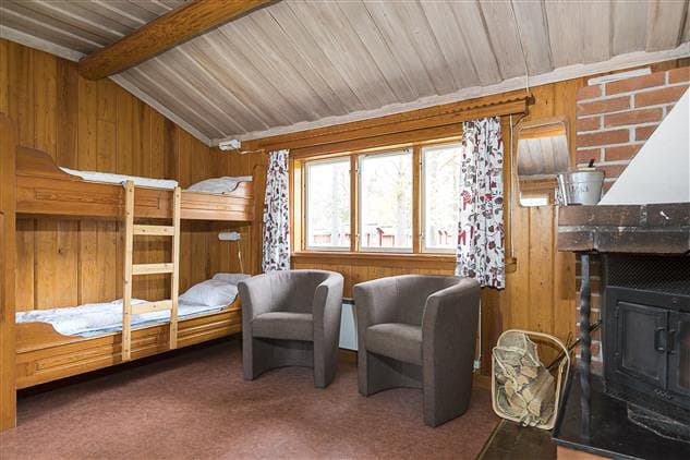 Orsastuga Plus is 43 sqm in size and can accommodate a total of six people. The cabin has a separate bedroom and a living room / kitchen. Four beds are in the living room (bunk beds) and a double bed in a separate bedroom. Duvets and pillows are available for all the cabin’s beds. The living room also has a dining area, wood burning stove and TV. The kitchen is equipped with simple utensils, refrigerator, stove, oven, perculator, microwave. The bathroom has a shower and toilet. Engine heater sockets are located outside the cabin.