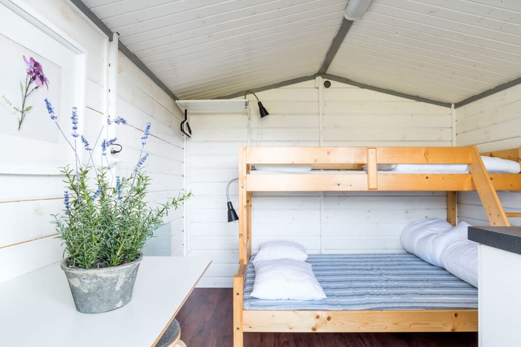 Simple camping cabin of 7 m² with 2–3 beds in a bunk bed (120+80 cm). TV, fridge, and coffee maker are provided, but there is no kitchenette or running water. Shower, toilet, and kitchen are available in the service building. A cozy and affordable accommodation option.