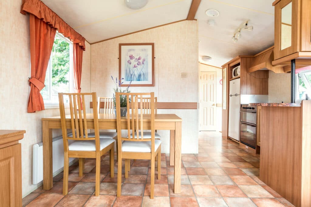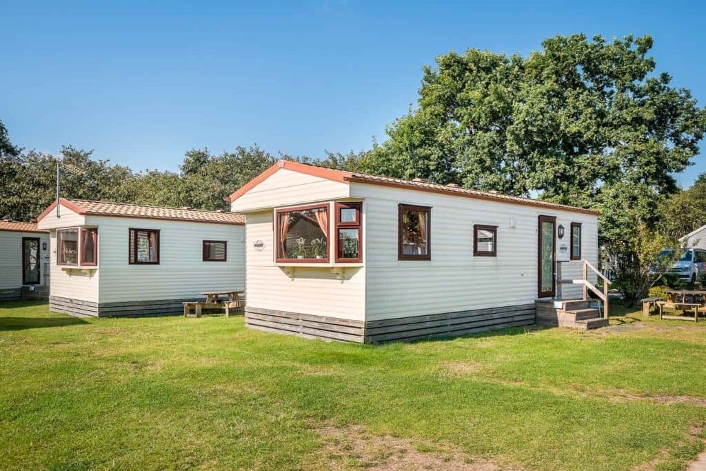 Mobile home with two bedrooms and a spacious living area. Fully equipped kitchen with fridge/freezer, stove, microwave, coffee maker, and a dining area with table and chairs. One bedroom has a double bed and the other has two single beds. Four regular beds, but an additional person can sleep on the sofa. Bathroom with shower and toilet. The mobile home is equipped with a TV with basic channels. During the summer, there is a furnished outdoor seating area. Bed linen and final cleaning can be added as extras.
