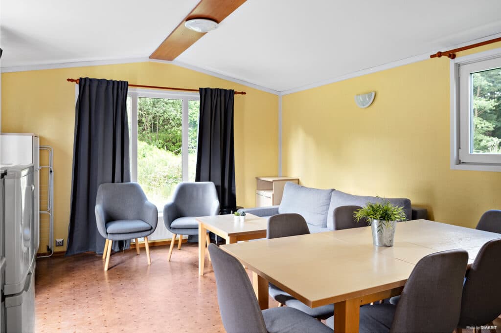 40 m² with 2 bedrooms, large sitting room with a sofa bed, toilet/shower. Large terrace facing our pond. A total of 6 beds. For rent April-October.