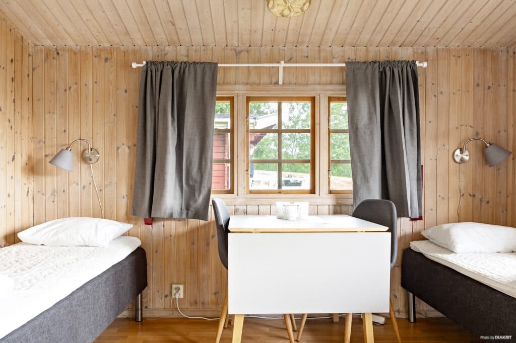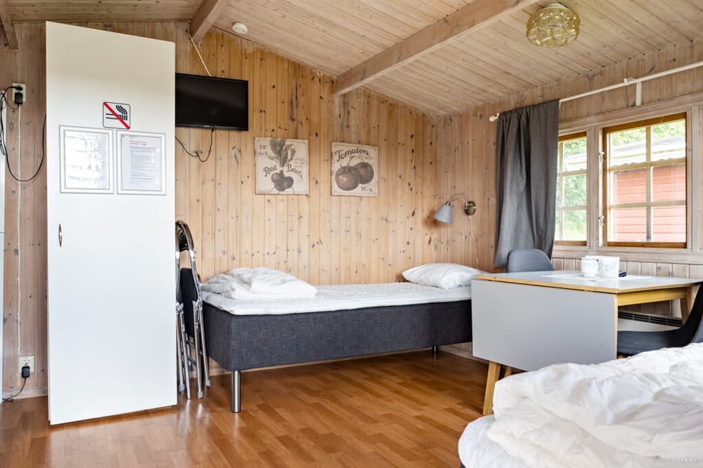Our traditional camping cabins are located right above the caravan park in area 1. They have 2 single beds and 1 bunk bed. They have a smaller kitchen with hotplates, fridge, microwave, coffee machine and household utensils. There are washing facilities, showers and toilets in our 3 nice service buildings that are within a short distance of the cabins. Every cabin has a terrace with a grill and outdoor furniture. Inside the cabin there are 4 chairs and a table. For rent April-October.
