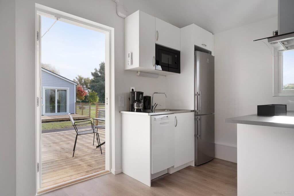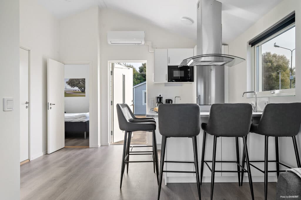 Welcome to the Bunkeflostuga cabin! This pleasant 40 m² cabin has an open floor plan and a furnished patio, the perfect place to relax with family and friends after a wonderful camping day. The cabin has two bedrooms, one with a double bed and one with two single beds. There is also a sofa bed in the living area that can sleep a further two people, which means that the cabin can accommodate up to six people. The fully equipped kitchen has a stove, oven, fridge/freezer, microwave and coffee maker. The cabin also has WiFi and a TV and a bathroom with shower and toilet, as well as a washer. Parking is available next to the cabin. Some of the cabins provide lovely views of the Öresund Bridge, and the patio can also be used during the winter period as it remains furnished with one set of patio furniture.