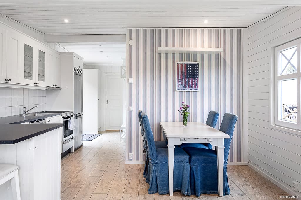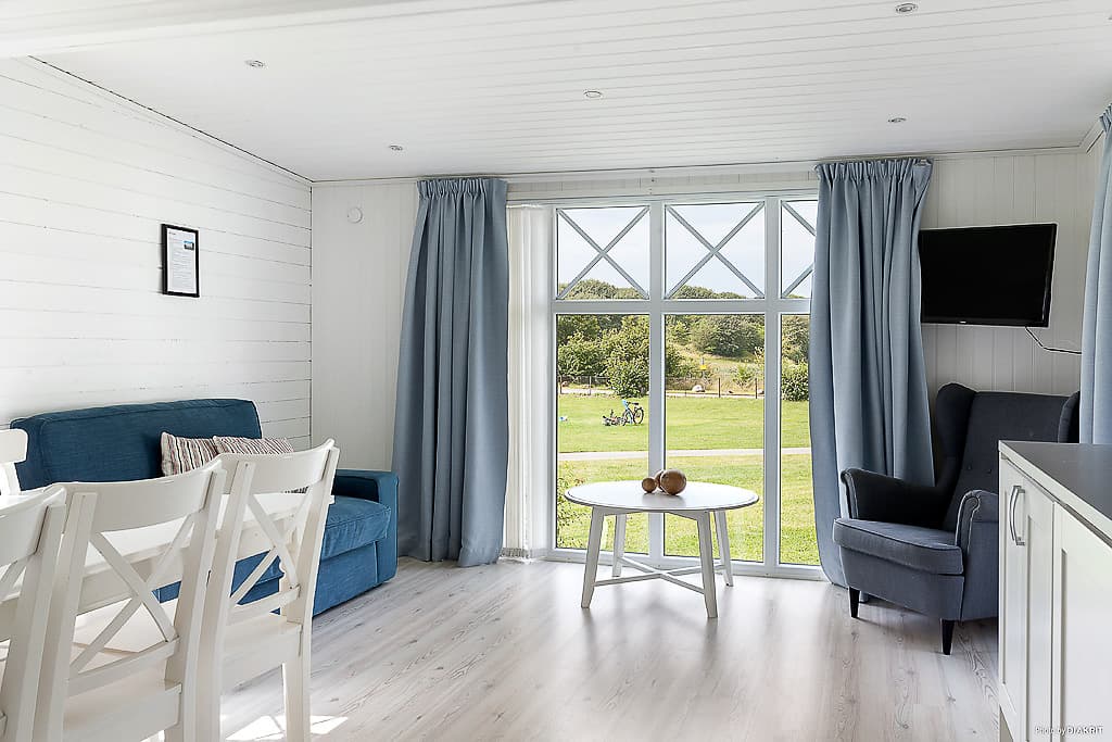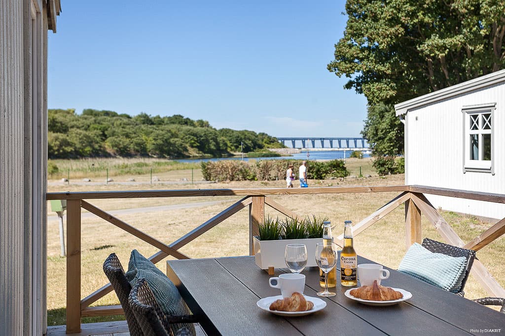 Copenhagen Cabin is an idyllically located cottage with the sea and the Öresund Bridge as neighbors. The cottage, which is the largest accommodation option at the campsite, is 40 square meters and cozily furnished. It can accommodate a total of six people. Inside the cottage, there is a spacious living room with a kitchen and dining area. The kitchen is fully equipped with a refrigerator, freezer, stove, oven, microwave, and dishwasher – all the conveniences for a relaxing vacation. The living room also features a comfortable seating area with a sofa bed and TV. There are two bedrooms, one with a double bed, and the other with two 80 cm beds. Duvets and pillows are provided for all the beds in the cottage. The bathroom is brightly tiled and has a shower and toilet. Outside the door, you’ll find a lovely furnished terrace with the campsite’s best view.
