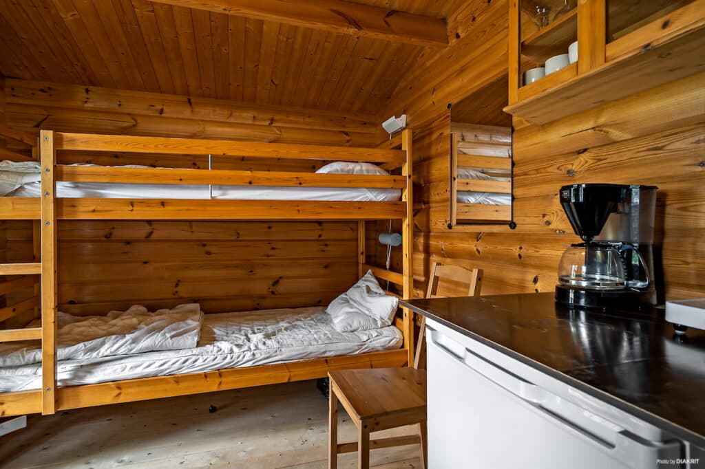 We have two Bökhulttorp cabins, these are not next to each other but are scattered in the campsite. Each cabin has room for four persons in two bunk beds and includes a dining area and the opportunity to cook. The cabin has no running water, but it must be collected in the shared kitchen or in the service building.