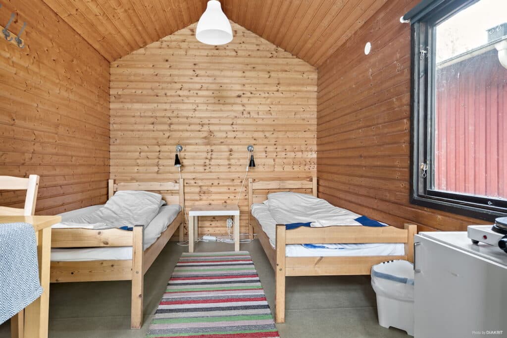 Möckelntorp is our only cabin with room for only two people in two single beds. The cabin is right on the waterfront and you wake up with a wonderful view of a bay in the lake. The cabin has a small dining area and the possibility to cook, water is missing in the cabin but can be picked up from the local area.