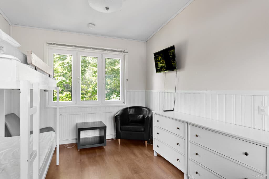 A modern apartment of 22 m² with six beds – two bunk beds and one double bed. Each bed comes with a mattress, duvet, and pillow. The apartment is furnished with a dining table and chairs for the entire group. In the living room, there are two armchairs, a coffee table, and a chest of drawers. The kitchen has two hot plates, a refrigerator, a microwave, and two pots, along with essential kitchen utensils and tableware for six people. The apartment has running water and a sink. Toilets and showers are located in a shared area just outside the apartment and are shared with the other apartment guests.