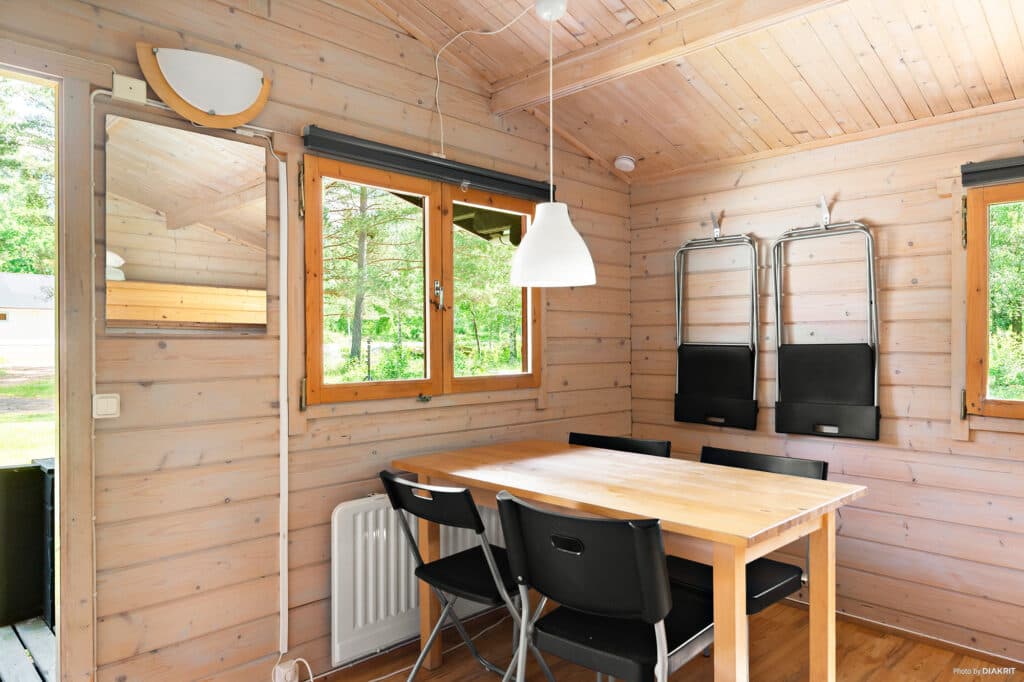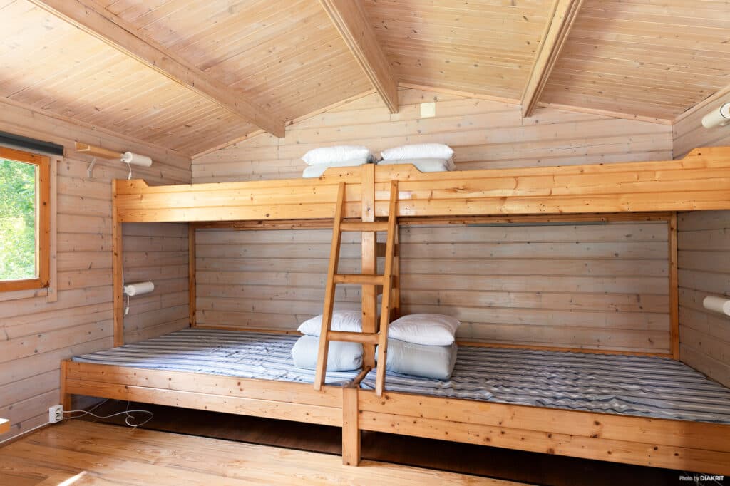 A homely cabin of 16 m² with space for up to 5–6 people. The beds are located in one bedroom with two bunk beds. Please note that there are only four actual sleeping spots, but the upper bed is 80 cm wide and the lower one is 120 cm. Each bed comes with a mattress, duvet, and pillow. The cabin is furnished with a dining table and chairs. The kitchen includes a refrigerator, microwave, two hot plates, two pots, and essential kitchen utensils and tableware for six people. There is no running water in the cabin, but a water container and washing basin are provided. If you need a frying pan, you’re welcome to borrow one from the reception.