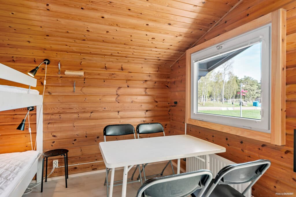 Lundbytorp is located in a quieter area of the campsite, a bit further from the reception and entrance. It is a smaller cabin of 12 m² with four beds, arranged in two bunk beds, each 80 cm wide. Each bed includes a mattress, duvet, and pillow. The cabin is furnished with a dining table and chairs. The kitchen includes a refrigerator, two hot plates, two pots, and the most essential kitchen utensils and tableware for four people. If you need a frying pan, feel free to borrow one from the reception. There is no running water in the cabin, but a water container and washing basin are provided. Showers, toilets, and a larger kitchen can be found in the shared service buildings on-site. Pets are welcome in this cabin.