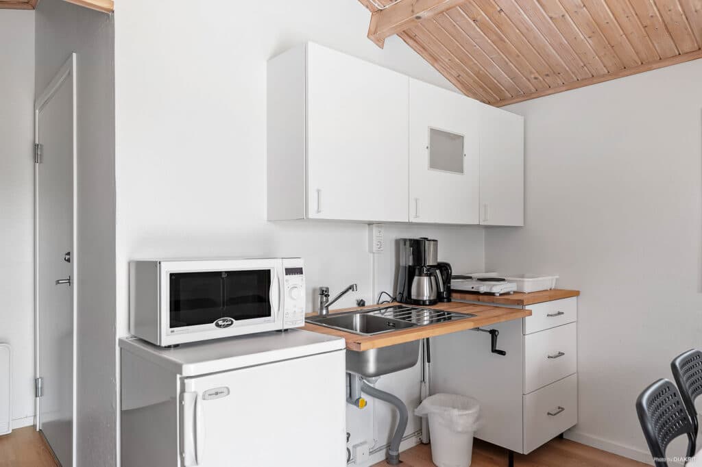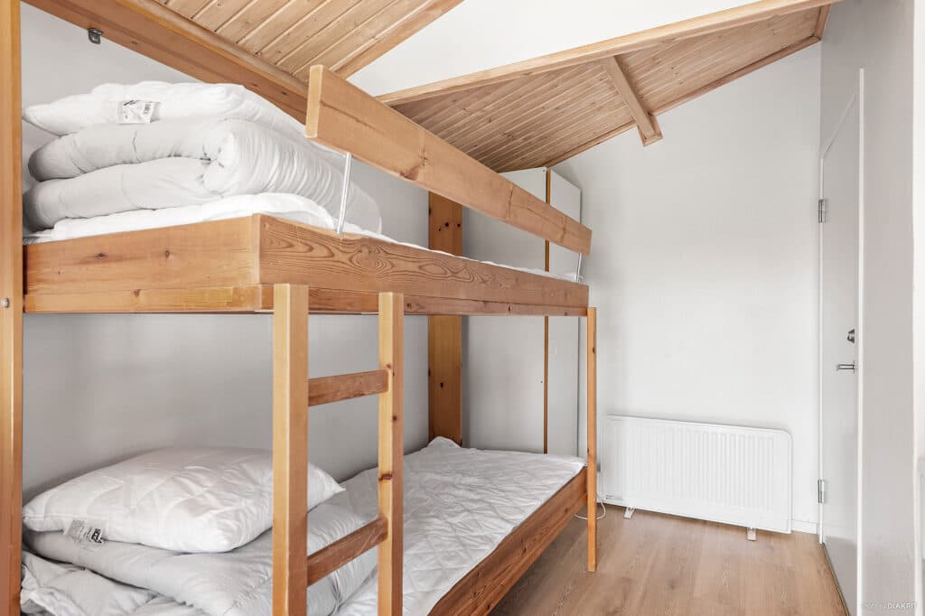 A slightly larger and homely cabin of 16 m² with four beds, distributed across two bunk beds and an additional bed. The upper bed is 80 cm wide and the lower one is 120 cm. Each bed includes a mattress, duvet, and pillow. The cabin is furnished with a dining table and chairs. The kitchen includes a refrigerator, microwave, two hot plates, two pots, as well as essential kitchen utensils and tableware for six people. The cabin has its own shower and toilet. If you need a frying pan, you are welcome to borrow one from the reception.