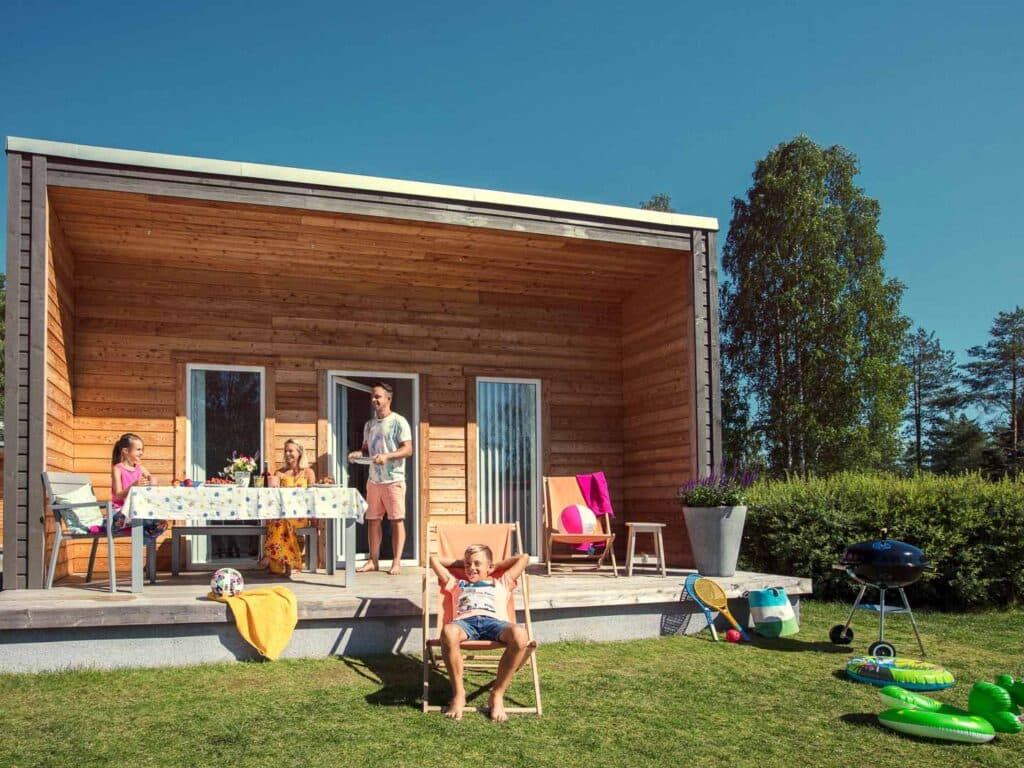 Welcome to one of the campsite’s larger cabins, 35 m² in size with six beds – two bunk beds (80 cm wide) and one double bed (160 cm wide). Each bed comes with a mattress, duvet, and pillow. The cabin has a private bathroom with toilet and shower. It is furnished with a dining table and chairs for the whole group, and there is also a TV. The kitchen includes a refrigerator, microwave, two hot plates, two pots, and essential kitchen utensils and tableware for six people. The cabin features its own terrace and space for two cars next to it.