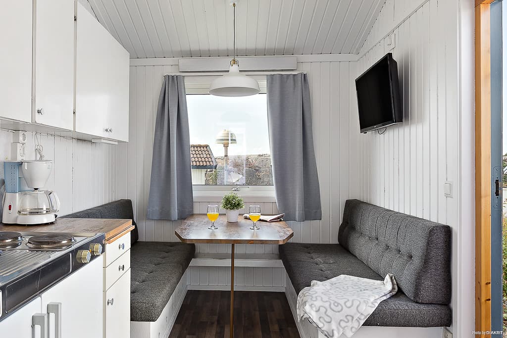 A tasteful accommodation of 22 sqm for the small family or friends, with a total of 6 beds. In these nice cabins there is a separate bedroom with two beds in the form of a bunk bed, two beds on the loft and a kitchen table and sofa which can be converted into a double bed. Blankets and pillows are available for all the beds. Outside the front door a nice furnished patio is waiting. The well-planned kitchenette consists of a fridge with freezer compartment, cooker and a dining area for five people. The bathroom is equipped with shower and toilet.