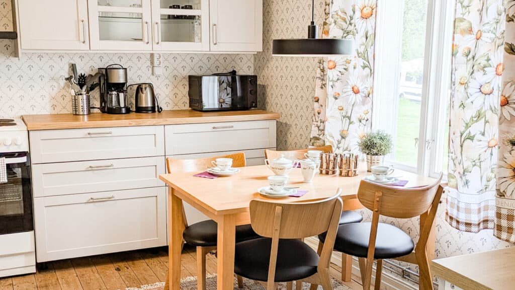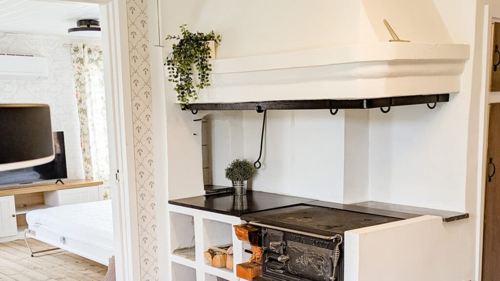 In the large living room, there is a sofa group and a wall-mounted double bed that can easily be folded down when it’s time to sleep. There is also a separate bedroom with a single bed, as well as a smaller room with a small single bed (70×180 cm). Pillows and duvets are provided for all beds; bring your own sheets and towels or add them directly when booking online. In the hallway there is a small toilet, and the kitchen is equipped with a stove with oven, fridge and freezer, microwave and coffee maker – everything you need to prepare tasty meals that can be enjoyed in the garden during summer.