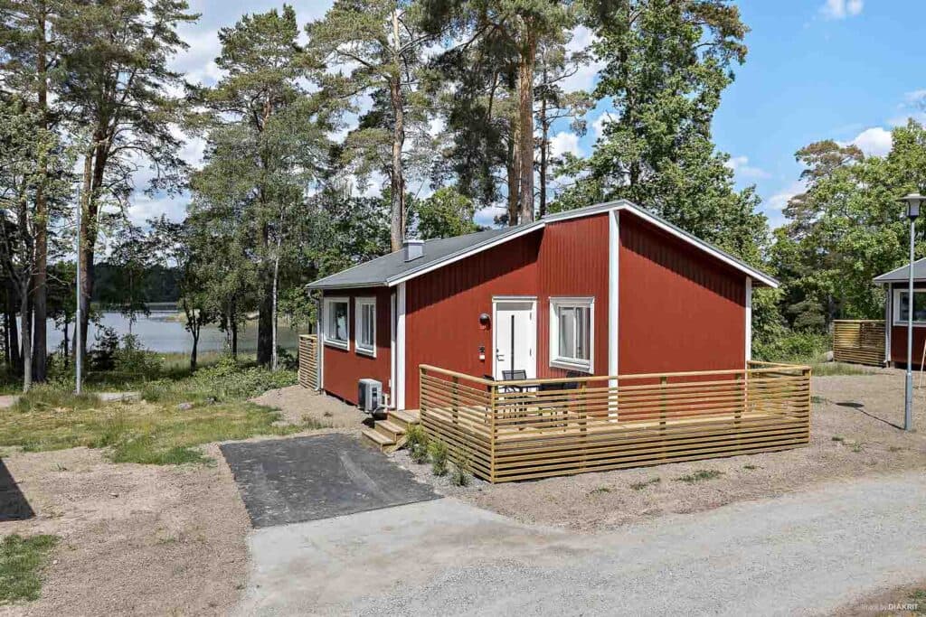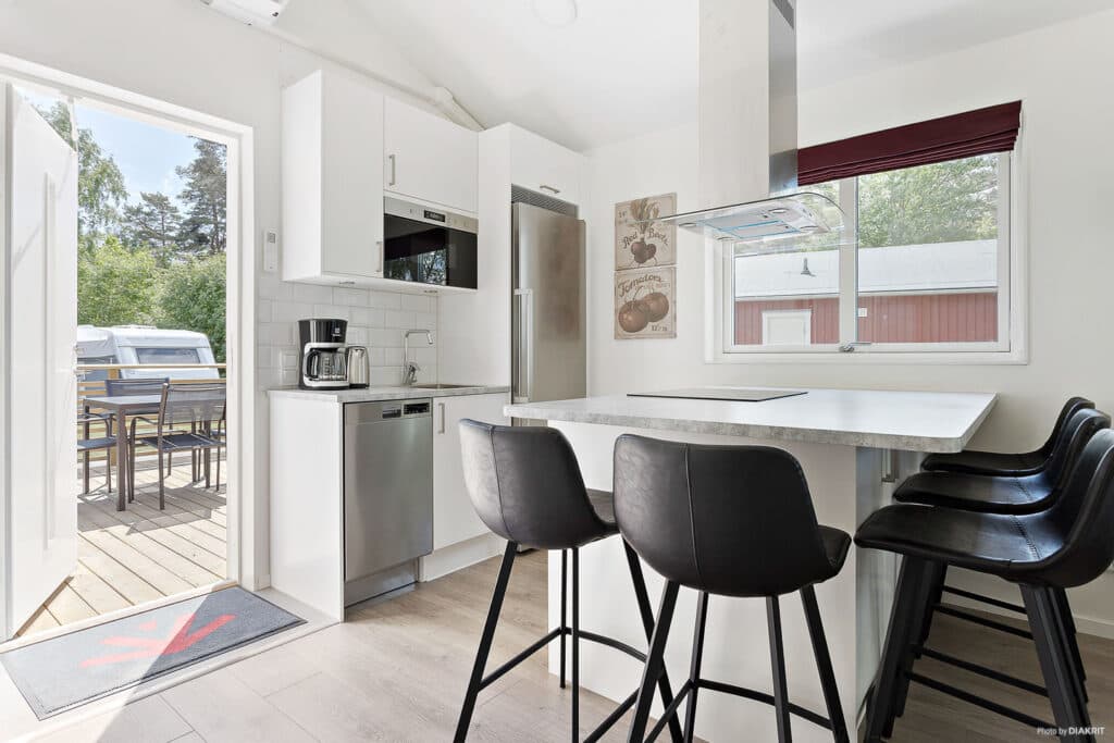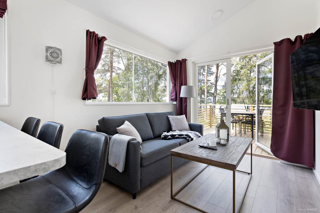 These light and airy cabins, 45 m2 in size, have an open floor plan and a large furnished terrace, perfect for social gatherings both indoors and outdoors. The cabins have room for up to six people, who can all get a good night’s sleep in comfortable beds. Each cabin has two bedrooms, one with a double bed and the other with two single beds. The living room has a sofa bed with room for another two people. Duvets and pillows are supplied for all beds in the cabin. In the fully equipped kitchen, you will find a stove, oven, fridge freezer, dishwasher, microwave, and of course a coffee maker. The living room has a TV and air conditioning. The bathroom has a shower and toilet, and a combination washer-dryer is located in the living room. There is parking next to the cabin.