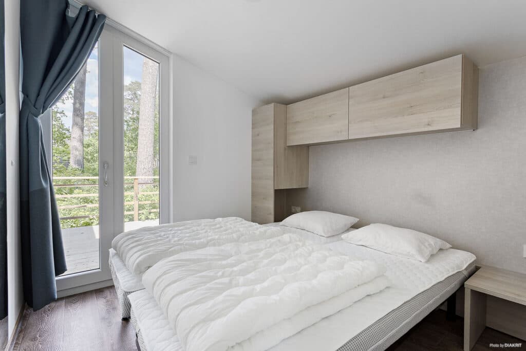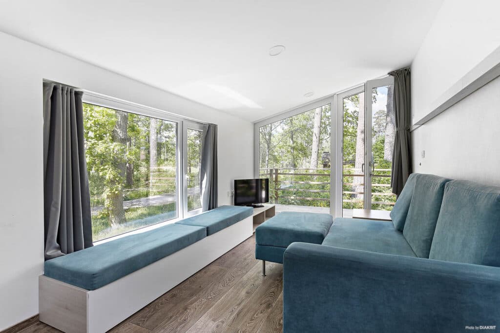 Our Stensö cabins are spread over 45 lovely square meters overlooking the water. Up to six people can enjoy the holiday in this cabin. The beds are divided into two bedrooms, one room with two single beds and one room with a bunk bed. The living room also offers sleepingarrangements in the sofa bed where one to two people can get a good night’s sleep. The cabin also has underfloor heating, a fully equipped kitchen with everything you need to cook a great dinner and large panoramic windows.