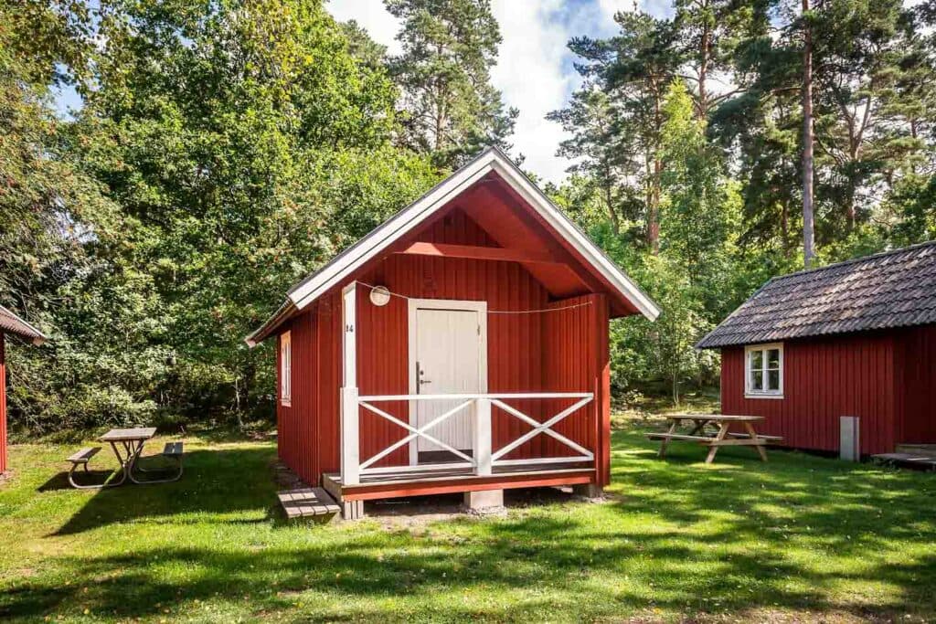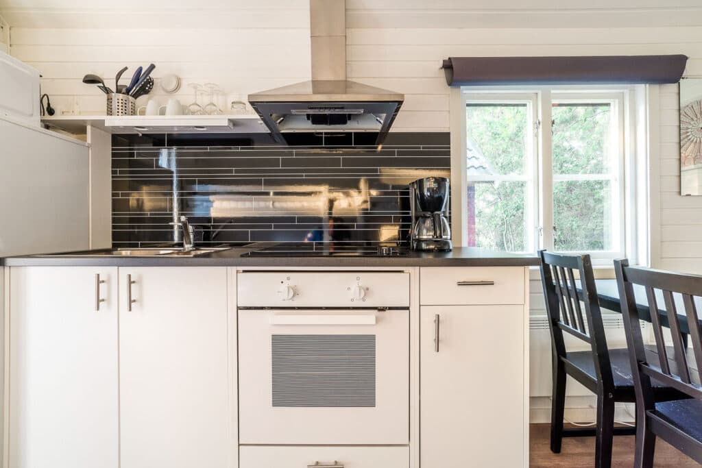 15 m² cabin with 4 beds, table and chairs, coffee maker, stove and oven, fridge and basic kitchen equipment for 4 people. You also have access to the toilet, shower and large kitchen in our service buildings a stone’s throw away.